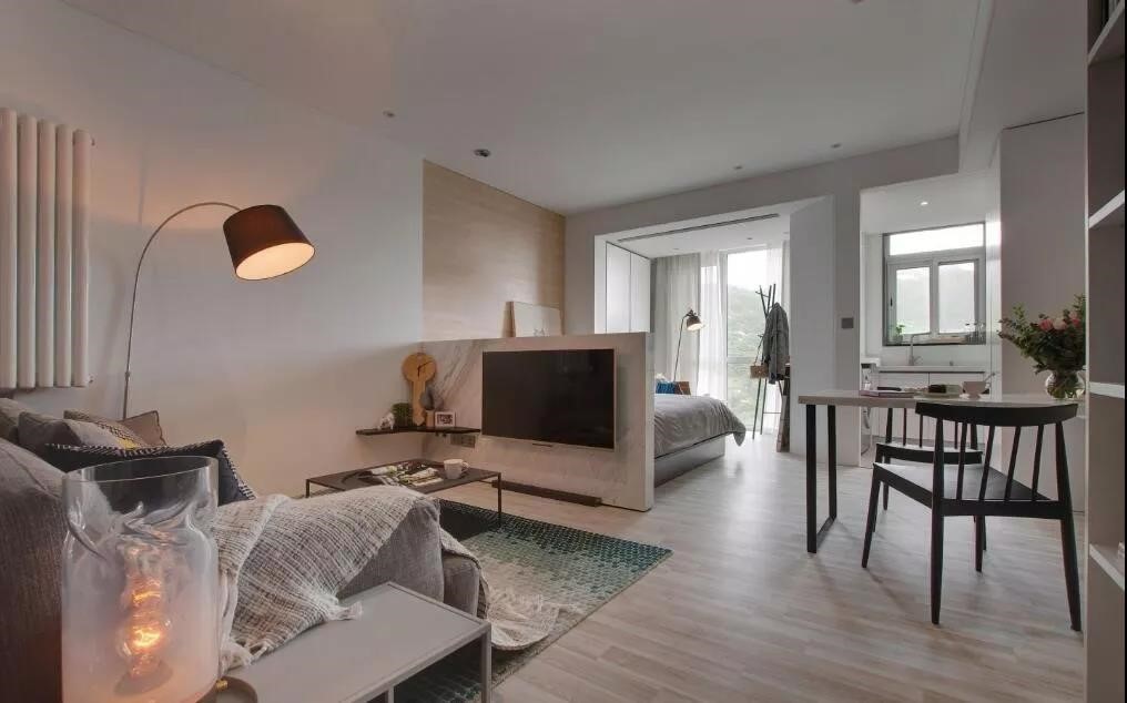 从玄关进来的空间一目了然,客厅、餐厅、卧室都在同一个空间里,开放式的设计让小户型的空间看起来更宽敞通透一些,所以小户型千万不要太多隔断。