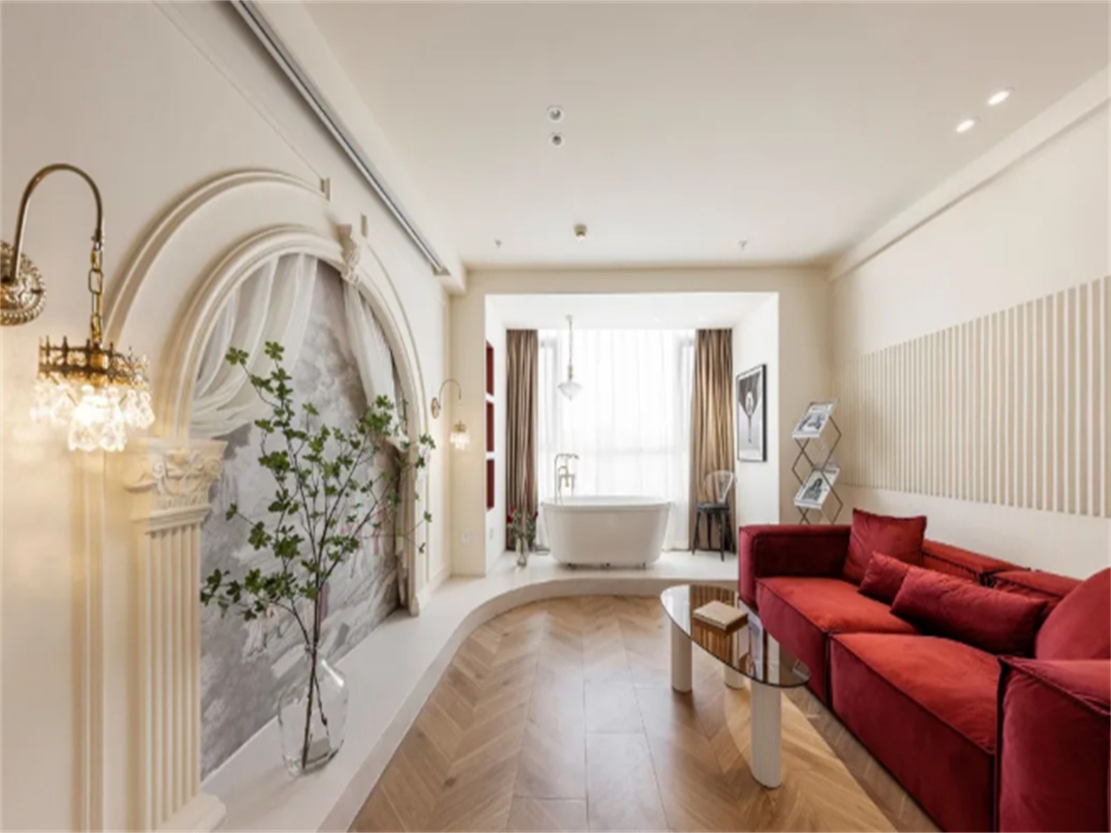 拱门造型的电视背景成为空间亮点,内部还预留了纱帘滑道与窗帘挂钩,吊顶内嵌了投影幕布,满足观影需求