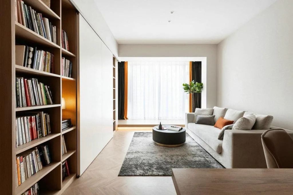 客厅用可开合书柜取代传统背景墙,收纳屋主的各种藏书,保留电视+灵活的吊轨移门设计,朋友和老人过来玩也能满足观影需求。