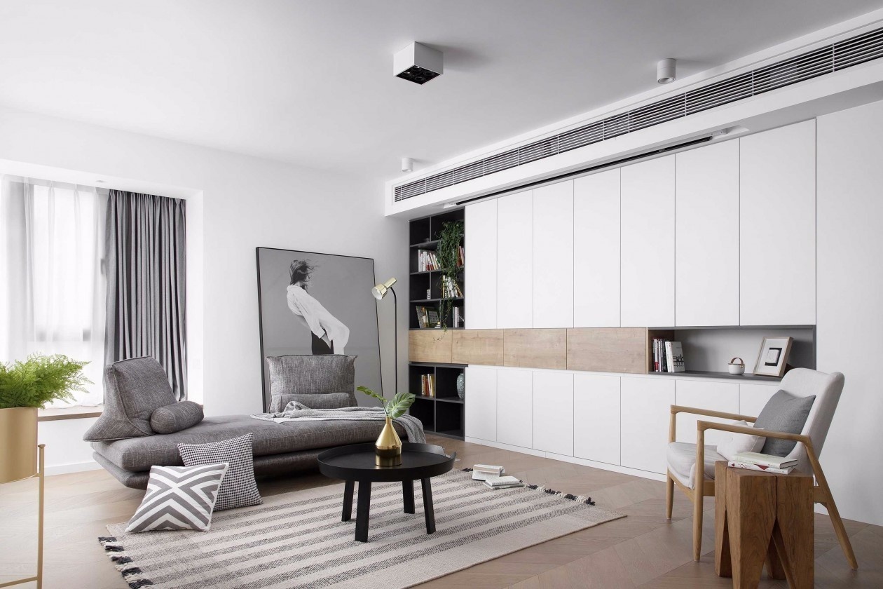 客厅沙发灰色系与白色,木色家具相搭配,非常和谐,美观。