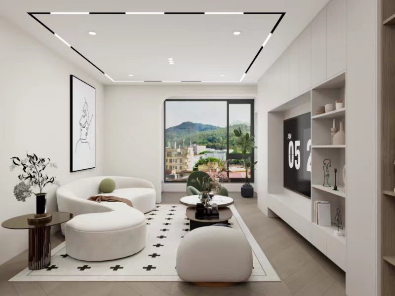 客厅的吊顶是做了一个回字形的线型灯,客厅背景主要是留白,释放视觉空间,非常简约大气