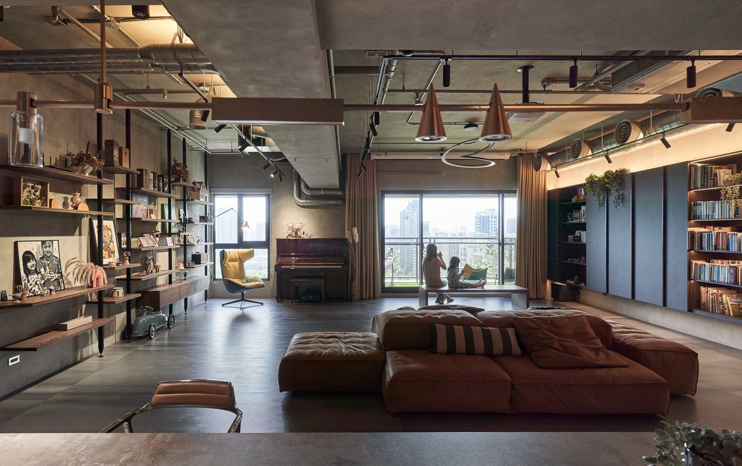 客厅以裸露的水泥顶、金属管线构建工业基底,却因复古皮沙发的暖棕、黄色单椅的跳脱,以及整面书墙的人文气息而充满温度。钢琴与绿植的点缀,让硬朗空间有了艺术与自然的呼吸感,都市景观透过巨幕落地窗成为动态背景,模糊了室内外的边界。