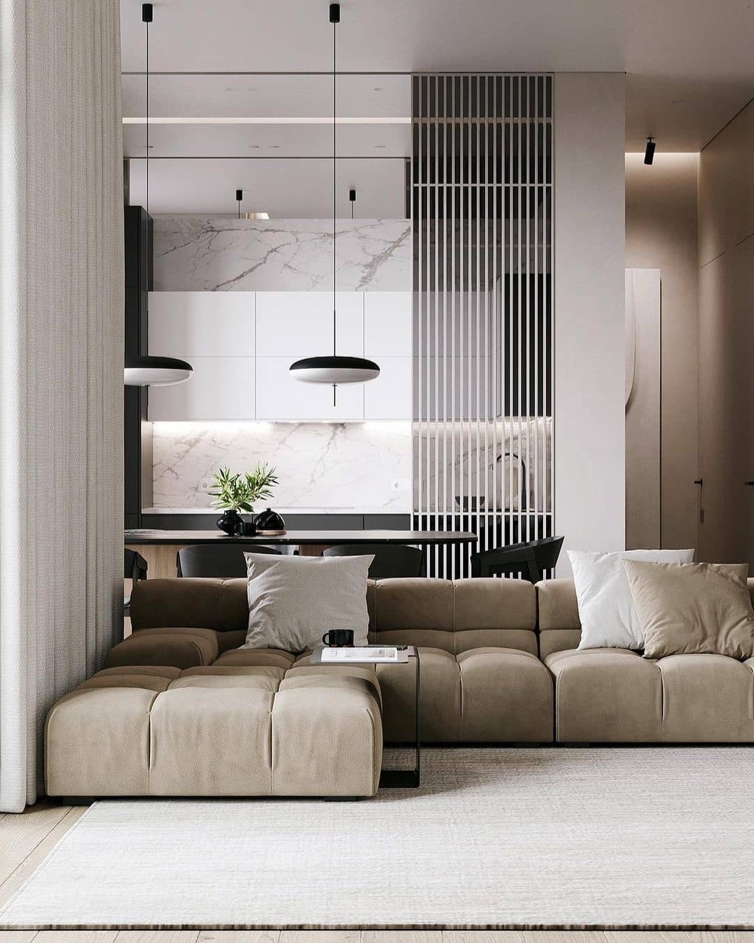 餐厅的整体色彩选择上是最为明显的轻奢风格体现,大理石台面的餐桌,创意吊灯,与半开放式的厨房相隔。