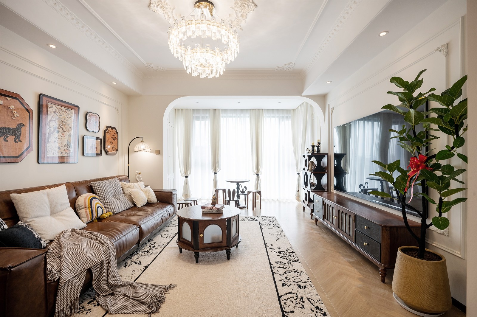 客厅与阳台之间的墙体经拆除后,原墙垛被重塑为一道优雅的拱形门洞,瞬间奠定了空间法式优雅的基调与高贵气质。阳台一隅摆放着藤编休闲椅与小圆几,构筑出一处令人向往的放松角落。 全屋通铺实木地板,温润的木色与天然木质纹理相互交织,为家注入令人心安的温暖质感。当晨光透过轻盈的白纱漫入室内,整个空间仿佛在光影中起舞,轻盈而从容,完美诠释了法式设计中“举重若轻”的美学真谛。