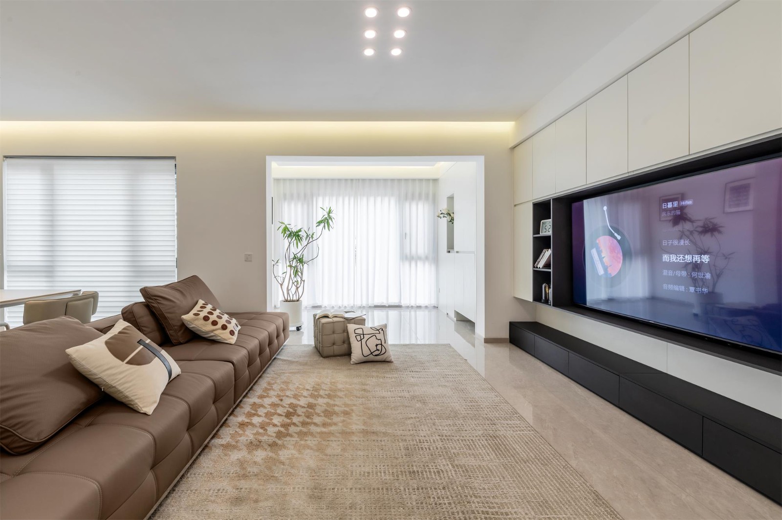 客厅将阳台并入后,整体通透感得到了显著提升。落地窗引入的丰沛光线,随时间在浅灰哑光地砖上流转,形成静默而富有韵律的光影变化。 阳台一侧定制了通顶储物柜,高效利用空间;柜体底部悬空,为扫地机器人预留了位置,巧妙兼顾收纳功能与智能生活需求。